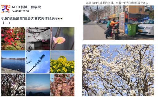 组织“疫新疫意”摄影大赛,发现生活中的美。特殊时期,虽不能返校共同学习,但可以共同分享身边的美好,一同记录这段难忘的时光。