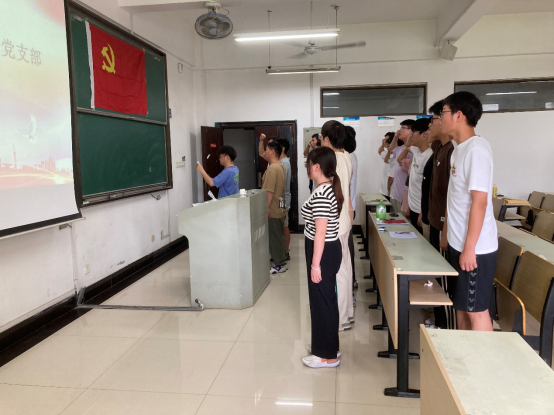 支部书记陈洁向参会党员汇报了应出席党员、正式党员人数与实际到会人数,到会正式党员人数超过支部正式党员半数,宣布会议有效。17名发展对象宣读入党志愿,汇报对党的认识、入党动机、本人履历、现实表现,并提出入党申请。入党介绍人介绍发展对象的主要情况,支委会分别报告了17名发展对象教育考察情况并表明发展意见。全体参会党员推选沈田鑫为计票人,王伟康为监票人。全体正式党员投票表决,对发展对象的现实表现进行了认真评议。支部书记陈洁宣读支部大会决议17名发展对象全票通过,同意接收为中共预备党员。最后,本次发展的17名预备党员在王伟康同志的带领下,面对党旗,庄严宣誓。