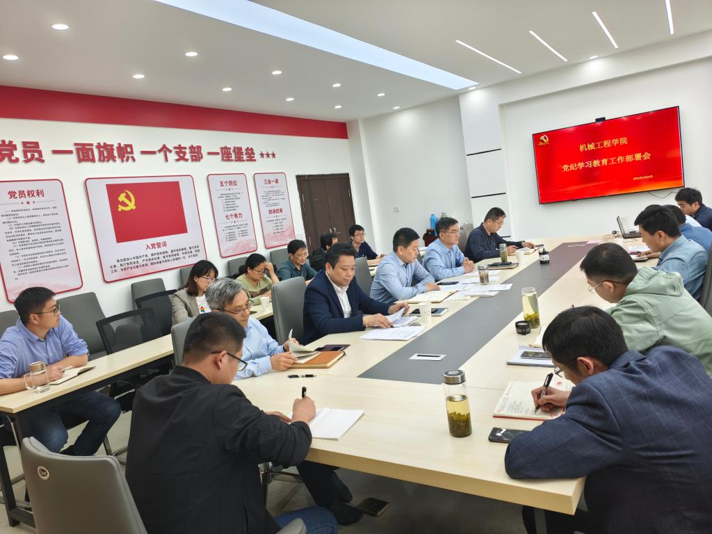 吴文兵传达学校党纪学习教育部署会精神,并对学院党纪学习教育工作作出安排。他要求,一要高度重视,明确意义。要从拥护“两个确立”、做到“两个维护”的政治高度,深刻认识开展党纪学习教育的重要意义,坚持以习近平新时代中国特色社会主义思想为指导,全面落实党纪学习教育重点举措,把握核心要求,做到学纪、知纪、明纪、守纪,搞清楚党的纪律规矩是什么,弄明白能干什么、不能干什么,把遵规守纪刻印在心,内化为日用而不觉的言行准则。二要加强学习,把握实质。各级党组织要深入学习习近平总书记关于党的纪律建设的重要论述,认真学习《条例》,紧扣如何把握“六项纪律”要求深入学习。采取举办读书班、党支部“三会一课”、个人自学、交流研讨、专题辅导、观看警示教育片等形式,深入开展学习,真正使学习党纪的过程成为增强纪律意识、提高党性修养的过程。三要学用结合,推动发展。必须结合实际学,在构建“三三五”党建工作大格局中,与迎接新一轮本科教育教学审核评估结合起来,与人才培养和博士点建设结合起来,学出履职本领和责任担当,将党纪学习教育融入日常、抓在经常,实现以学促干一体推进,以良好的学习教育成效推动机械学院高质量发展。