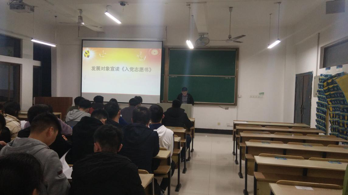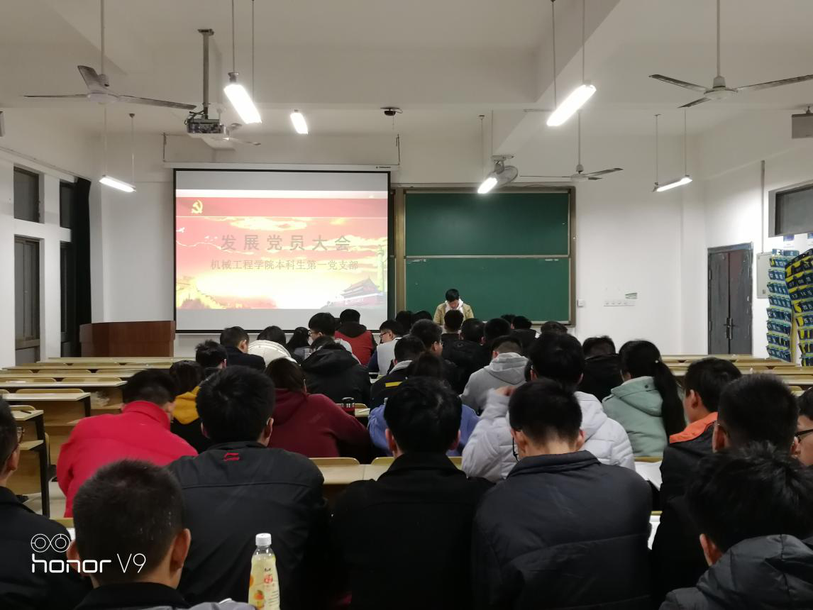 2018年11月26日437ccm必赢国际版本科生第一党支部在机械楼407教室召开了入党积极分子发展为中共预备党员大会,该会议由本科生第一党支部书记章军同志主持召开,本科生第一党支部的正式党员及预备党员参加了此次会议。