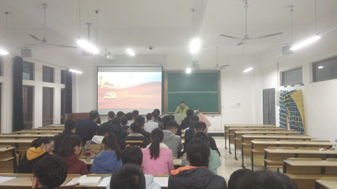 2018年10月27日晚上,437ccm必赢国际版本科生第一党支部党支部于机械楼405教室集中学习了新修订的《中国共产党纪律处分条例》(以下简称《条例》),会议由党支部书记章军主持。