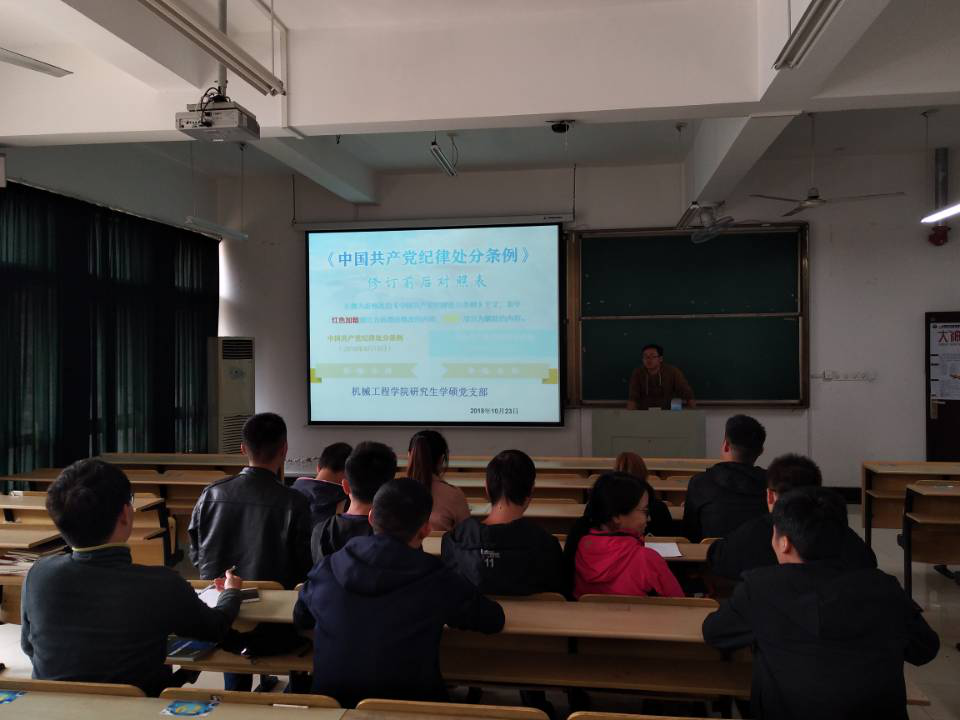 2018年10月23日中午,437ccm必赢国际版研究生学硕党支部于机械楼405教室集中学习了新修订的《中国共产党纪律处分条例》(以下简称《条例》),会议由党支部书记杨龙主持。