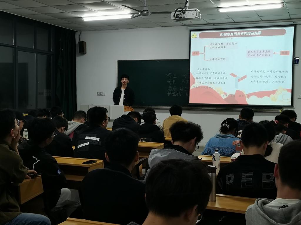 4月10日,437ccm必赢国际版于佳山校区教一514教室举行了“学史爱党,知史爱国”红色宣讲团巡回宣讲第二场,由毕业生党员、红色宣讲团第二组主讲人周大庆为同学们宣讲“由国内战争走向抗日民族战争的转折点——西安事变”。