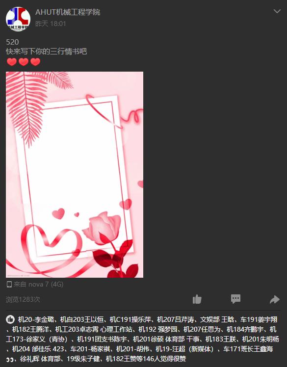 5月20日寓意“我爱你”,在这个甜蜜的日子里,为了让更多的同学可以表达自己对亲人、爱人、朋友、社会的爱,增加同学之间的感情,培养大学生良好的品质,437ccm必赢国际版组织了“三行情书活动”。