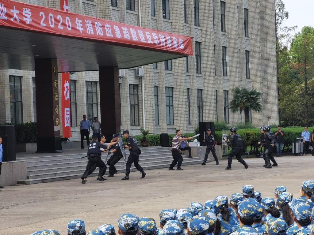 此次应急演练分消防演练与反恐演习两部分。消防演练中假设高层发生火灾,学生用毛巾捂着口鼻,依次有序跑步离开大楼,消防救援人员通过高压水枪扑灭火源,通过云梯解救高层被困人员。反恐演习假设的背景是因为网络贷款,对方前来要挟,拿砍刀威胁,突发状况后,保安、民警、特警依次出来,武力制服了危险分子。整个演练过程,同学们精神高度集中,认真听从指挥。