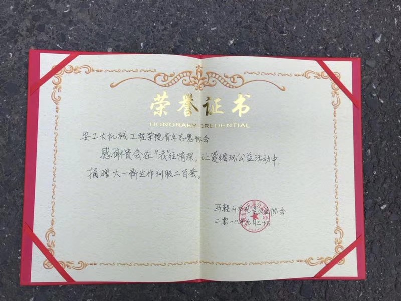 9月25日至28日,机械工程学院青年志愿者协会开展了“携手凡星会,回收军训蓝”活动,此次活动以“勤俭,节约,奉献,友爱”为主题,18级机械学子都积极投身于军训服装的回收中去。 最终,机械学院共回收军训服装200套。9月30日,凡星公益协会会长甘国庆亲自来到佳山校区进行军训服装的接收工作,并为机械学院青年志愿者协会颁发荣誉证书。