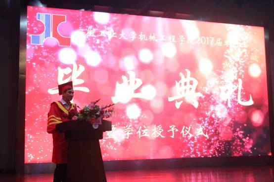 陈润作了热情洋溢的讲话。他代表学校向圆满完成学业的毕业生表示祝贺,并提出了殷切希望:一是要有追求理想的情怀。积极响应国家“大众创新,万众创业”的号召,努力守护自己的理想,充分激发内心的正能量,以乐观向上的信念、百折不挠的精神面对一切。二要有追求卓越的坚持。始终坚持和弘扬“精工博学、厚德敏行”校训精神,自觉做安工大精神的传承者、践行者和守护者,勇于探索,敢于创新,自强不息,追求卓越。三要有对社会的责任和爱。怀揣一份对社会的爱和责任,既志存高远,又脚踏实地;既顺应潮流,又勇于担当,将个人的梦想融入民族复兴的中国梦,在中国特色社会主义伟大实践中焕发青春的光彩。