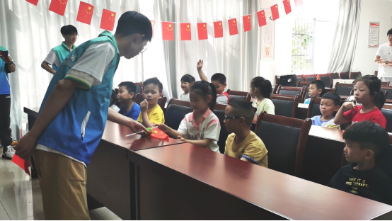 图为小朋友们在积极抢答实践队员提出的气象知识小问题。