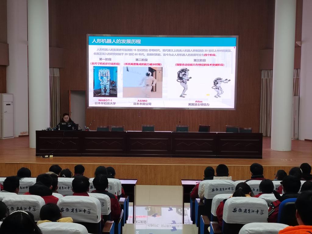 活动现场,王博首先向在场学生介绍了学校及学院招生政策、校园环境、专业情况,鼓励学弟学妹们认真学习,争取考上理想的大学。随后,王博结合自己的专业特点以“创新未来:人形机器人与可穿戴电子的融合之路”为题,开展了专题报告,通过一段精彩的机器人舞蹈,向同学们展示了机械、电子科技之美,活动现场,气氛热烈,爆发出阵阵掌声。