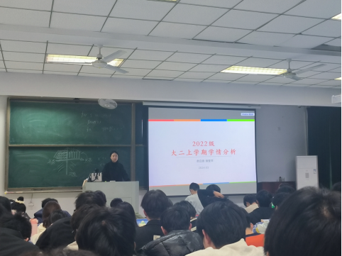 会上,濮莹萍通过PPT数据分析对各班大二上学期期末考试的各门课及格率、各门课高分段和低分段、各班挂科率等情况进行了详细对比分析。随后,对学生进行分类引导;对于学有余力的学生,重点介绍了学院的保研政策,并再次强调各类评奖评优的政策,以此激励同学们继续保持学习热情,取得更优异的学习成绩;对于学习方面存在困难的同学,辅导员引导同学们梳理自己的薄弱科目,结合自身情况制订学习计划,定期前往辅导员办公室汇报交流学习进展,并提醒学困生要端正学习态度,抓紧时间查缺补漏,争取在大二下学期结束时成绩有所提升。