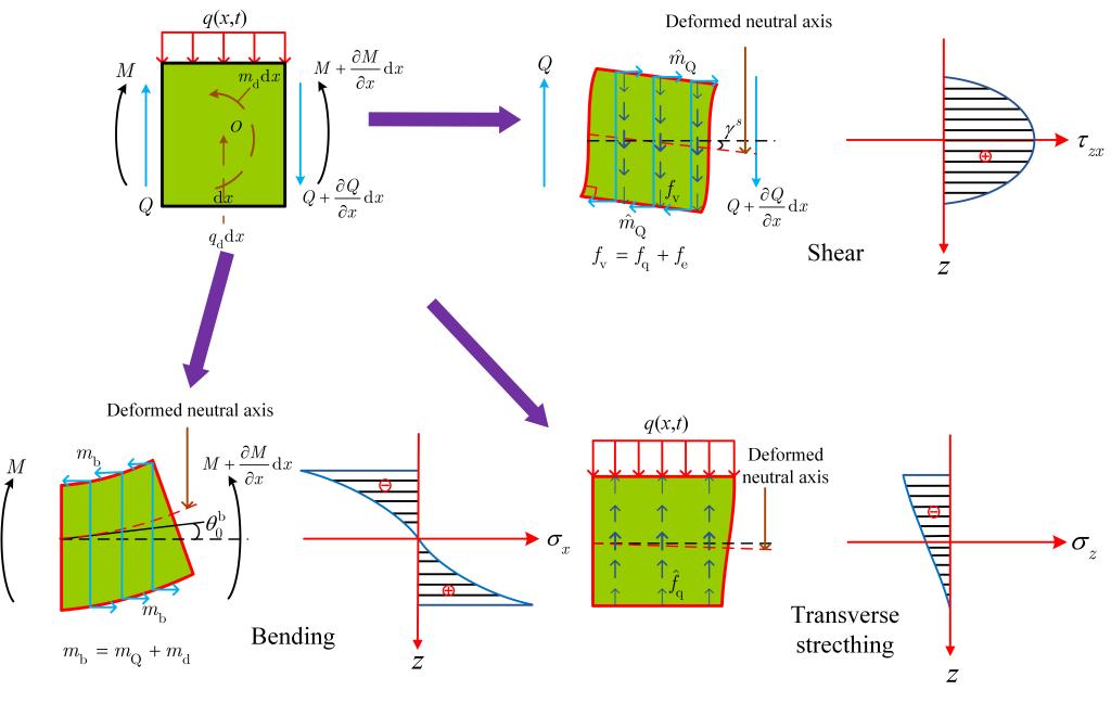 此外,为准确预测平面深梁的振动、弯曲和屈曲响应,本研究采用变形分解方法,提出了一种精确、高效而通用的高阶剪切变形梁理论。该理论基于弹性力学,将梁的变形分解为弯曲、剪切和挤压三个相对独立的部分进行精确分析,并根据不同变形间的内在联系(平衡关系)避免了额外变量的引入,针对平面梁的静力、振动和屈曲问题获得了高精度的响应结果。物理意义清晰、计算方便高效、响应预测精准,可进一步应用于非均质材料、多场耦合、强非线性等复杂梁问题。相关研究成果发表在《Engineering Structures》,论文与浙江大学合作完成,我校为论文第一单位,437ccm必赢国际版胡文锋副教授为第一作者,刘涛高级实验师和浙江大学陈伟球教授为共同通讯作者。