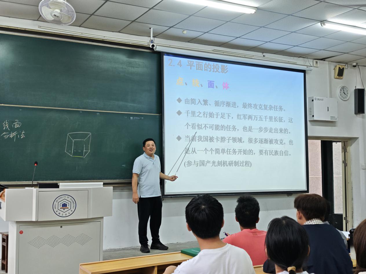 谈莉斌老师的授课内容为“基本立体投影”,通过类比点、线、面、体由简入繁的学习过程,介绍国家重大装备研制循序渐进、最终攻克复杂任务的研制流程。通过列举当前我国被卡脖子领域逐渐被攻克的具体案例,强调这些案例也是从一个个简单任务开始的,引导学生在学习过程中要脚踏实地学好每一个基础知识点。如港珠澳大桥总工程师林鸣带领团队攻克300余项专利,设计图纸堆高达1.5米,他们用智慧和汗水打造了这座世纪工程,体现了现代工程师的使命担当。“中国天眼”FAST射电望远镜馈源舱图样设计面临诸多挑战,工程师们通过不断创新和努力,成功完成设计,为我国的天文研究提供了有力支持。通过以上案例地讲解,鼓励学生在工程图学的学习和工作中,以当代大国工匠为榜样,将精益求精的精神内化为自己的职业追求,不断提高自己的专业水平。