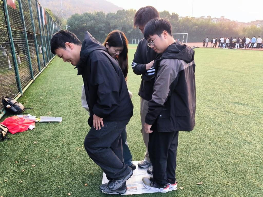 活动设有“两人三足”、“珠行万里”、“纸上站兵”三个环节,现场气氛热烈,精彩纷呈。“两人三足”环节中,党员们两两一组,绑紧脚踝后齐声喊着口号稳步前行,从最初的步伐不一到后来的默契配合,大家在欢笑中打破隔阂,快速凝聚起团队向心力;“珠行万里”环节中,队员们利用废旧报纸制作轨道,在精准接力传递乒乓球的过程中,将环保理念与团队策略完美结合;“纸上站兵”环节中,成员们在不断缩小的报纸上相互扶持、集思广益,共同完成挑战,深刻体现了团结协作和攻坚克难的精神。