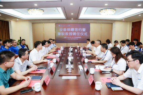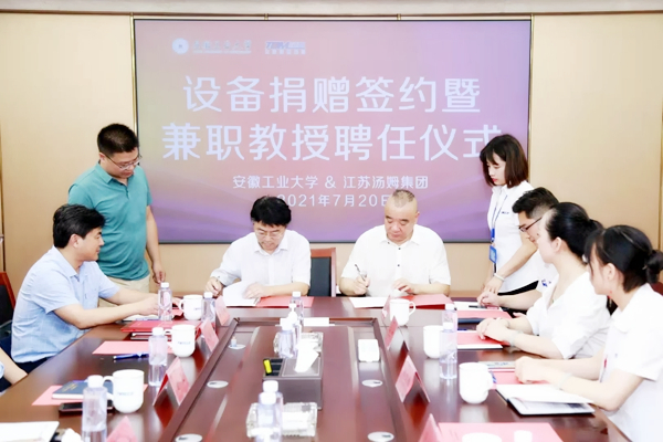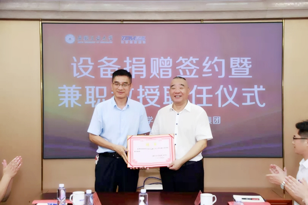 7月20日下午,校长魏先文一行走访调研江苏汤姆集团,和江苏汤姆集团董事长汤建华共同出席设备捐赠签约暨兼职教授聘任仪式。党委宣传部、校友工作处(教育发展基金会秘书处)、机械学院等部门负责人,江苏汤姆集团党支部书记郭文娟、总裁张正宝、汤姆森智能装备有限公司总经理王芳,我校在汤姆集团参加社会实践的师生以及在汤姆集团就业的校友参加仪式。