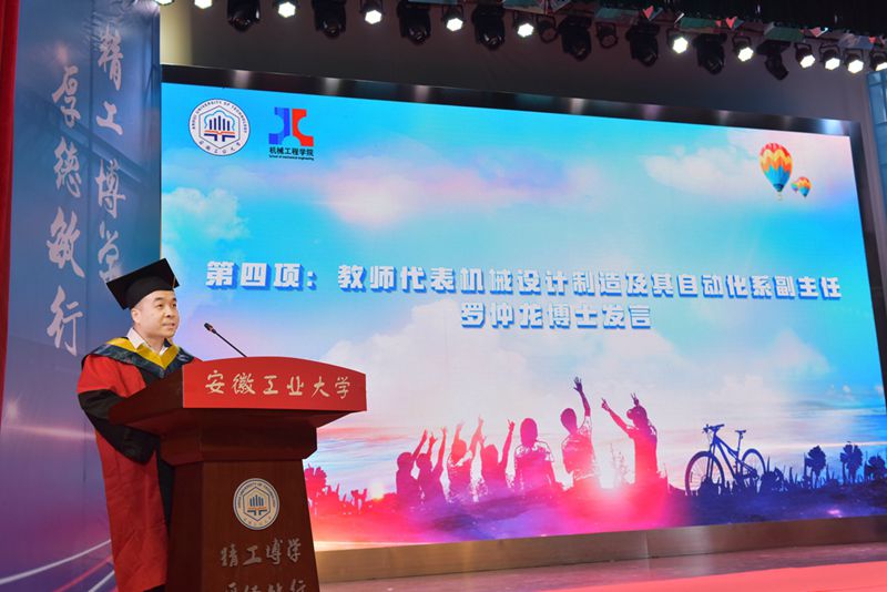 教师代表罗仲龙向毕业生们送上了“学会内省,持续学习”、“学会勇气,敢于践行”、“学会选择,懂得责任”的临别赠言;家长代表樊勇表达了对学校的由衷感激和美好祝愿;研究生毕业生代表应万明深情感怀“幸入工大,幸得良师,幸遇良友”的九年在校时光;本科生毕业生代表童向贤回顾了大学的难忘点滴,表达了对母校的感恩之情。