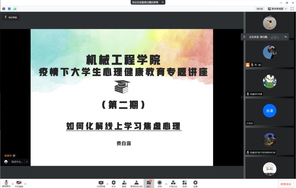 讲座共分为4期,主题分别为“携手防疫从心开始”、“如何化解线上学习焦虑心理”、“毕业焦虑你中招了没”、“如何预防春季心理‘感冒’”,针对不同主题,学院分别组织心理健康委员、毕业生、学困生等特殊群体进行专项学习,围绕封校孤独烦闷、人际焦虑、学业困扰等具体问题,一一介绍调整应对方式方法,帮助学生健康心理、健康生活。(撰稿:费白露 审核:李克明)
