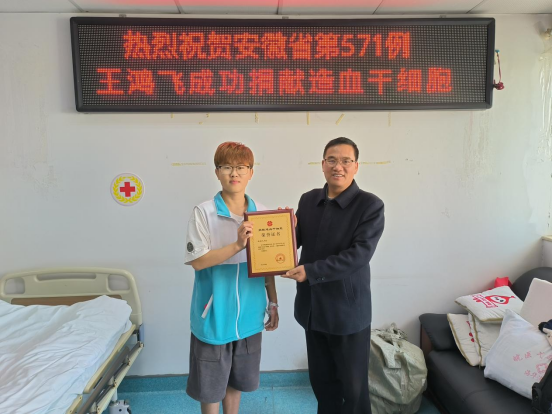 下午2点,历经4小时30分钟,王鸿飞同学成功捐献造血干细胞混悬液284毫升,成为我校第3位捐献造血干细胞的在校大学生、中华骨髓库安徽省第571例、也是马鞍山市最年轻的捐献者,他的造血干细胞将为一名重症患者带去生的希望,赵龙为其颁发了《捐献造血干细胞》荣誉证书。(撰稿:费白露 审核:濮莹萍 周环 陈庆林)
