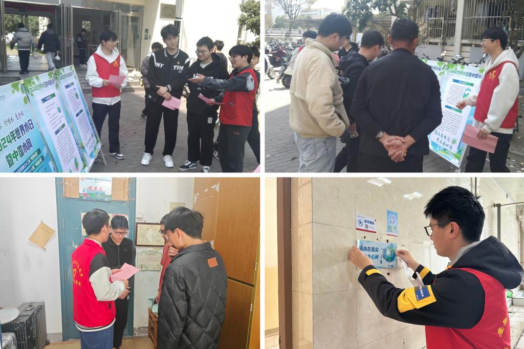 活动现场设置节水宣传展板,图文并茂地介绍世界水日和中国水周的由来、设立目的及意义等内容。沈国鑫、吴金龙、张世昌等志愿宣传员走进学生宿舍为同学们细致讲解当下水资源的珍贵性和全球面临的水危机,节约用水的重要性,科普生活节水的小常识,号召大家从日常生活中的点滴做起,节约用水,共同保护宝贵的水资源。宣传活动结束后,志愿者走进公寓水房张贴节水小贴士。